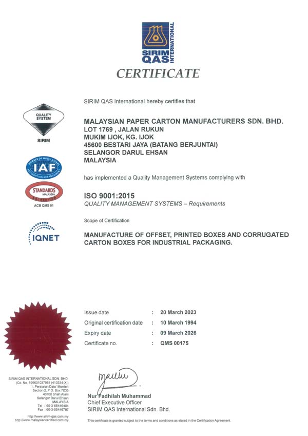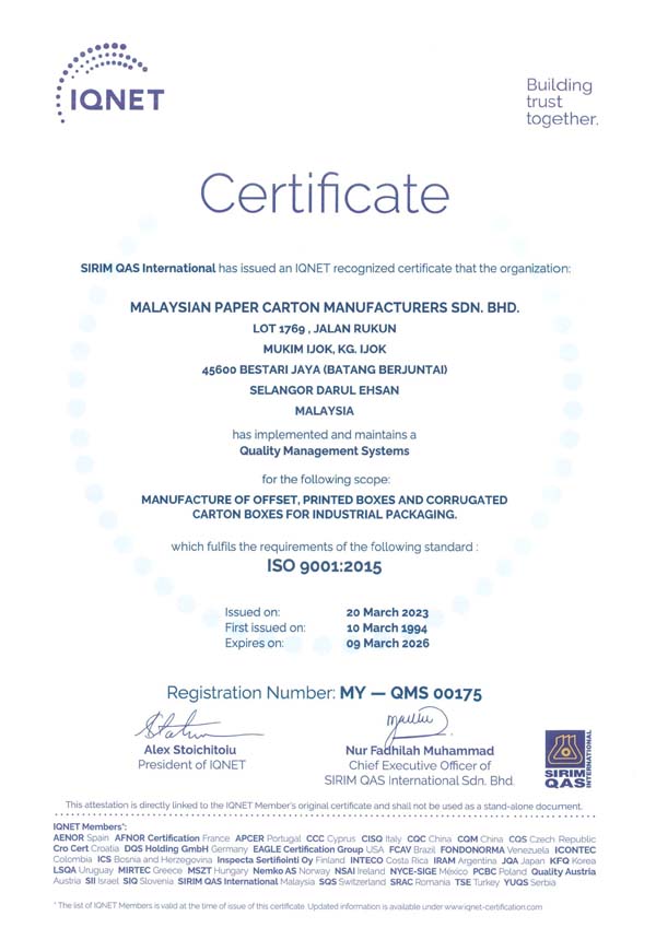 Malaysia Paper Carton Manufacturers Sdn Bhd was incorporated at Kepong Industrial Park, Kuala Lumpur, Malaysia on 5th October 1973. Our core business activity is in the manufacturing of paper products, including offset printing, corrugated displays, carton boxes, paper board printings and paper environment friendly products.